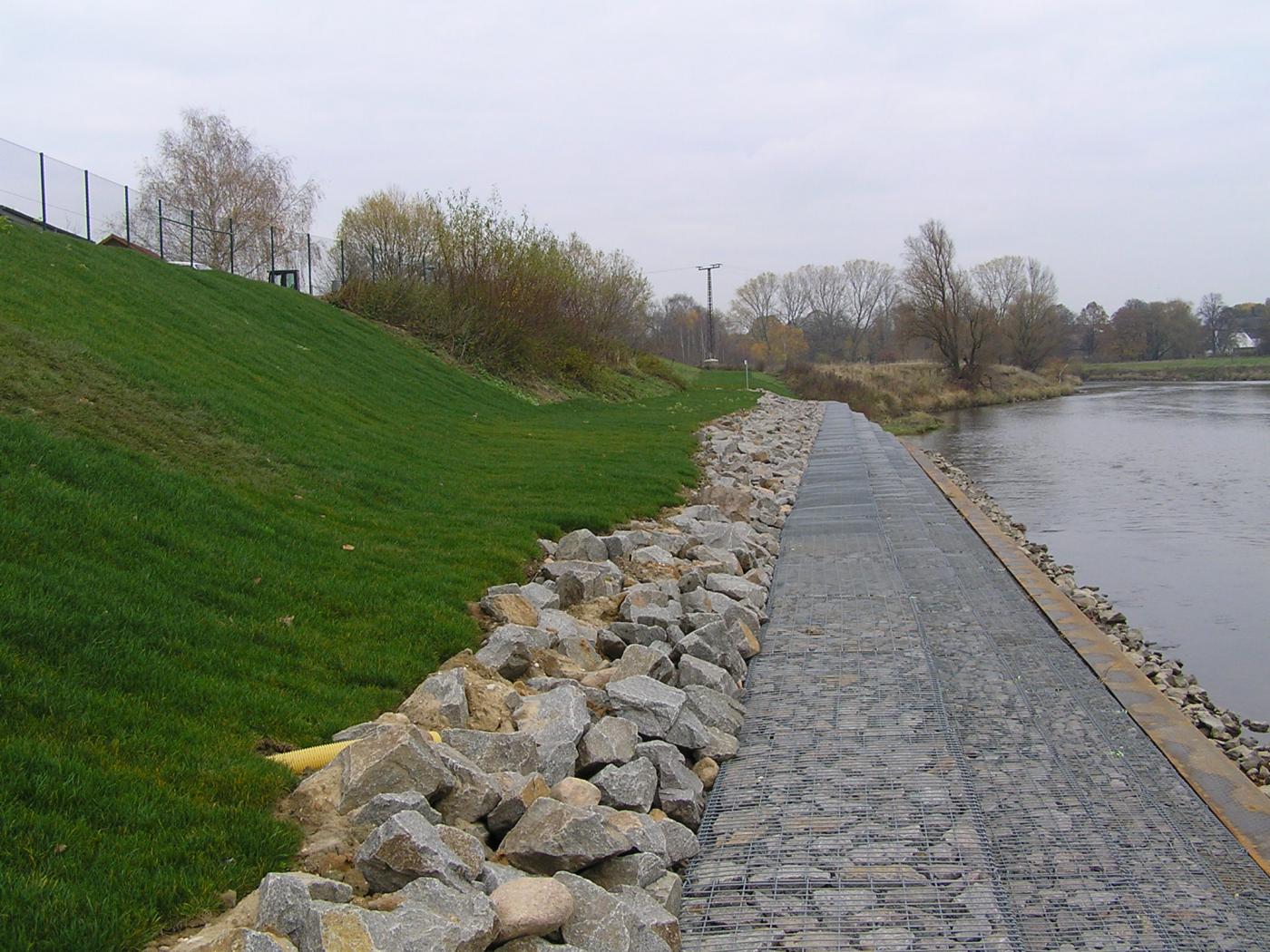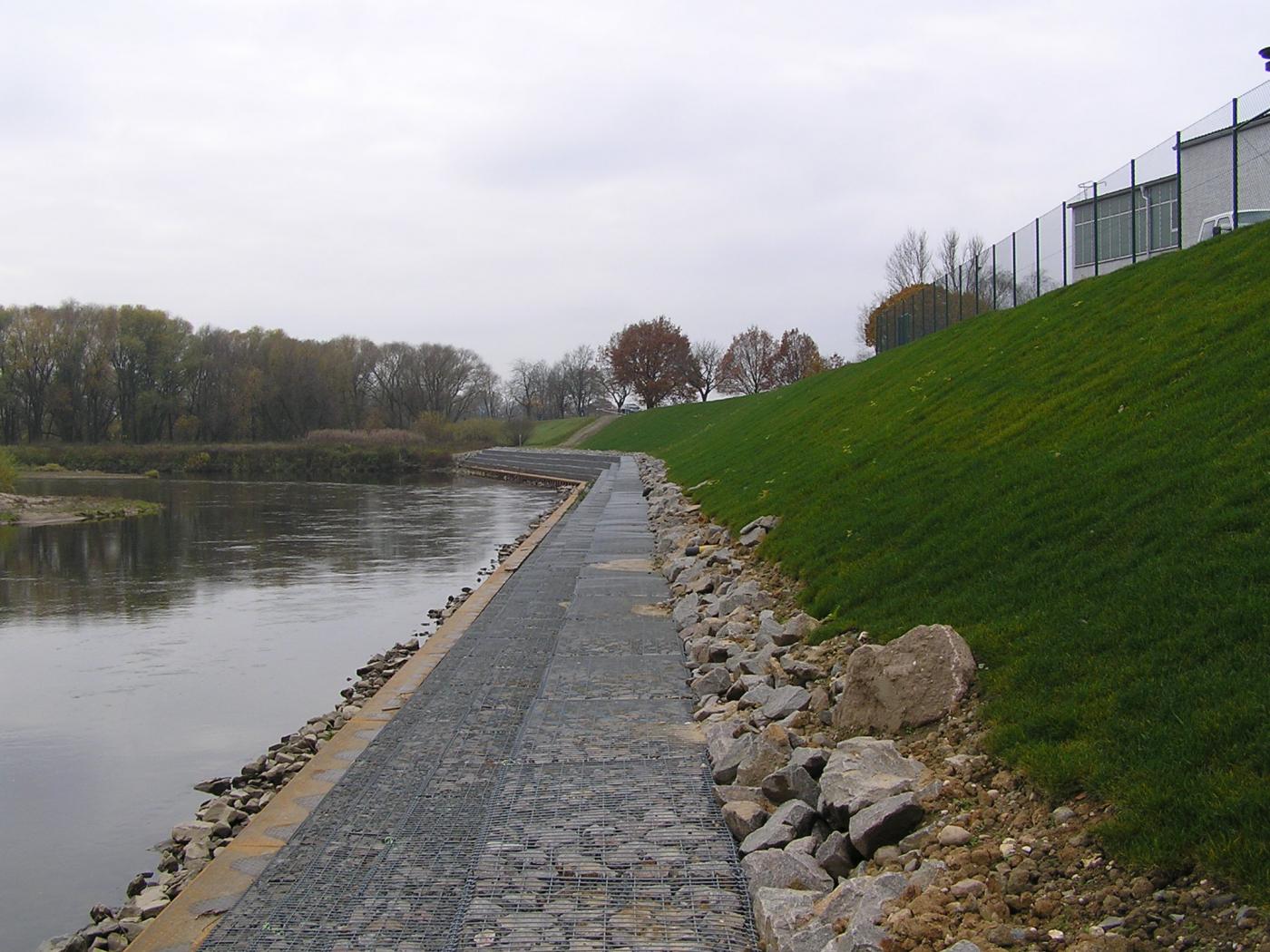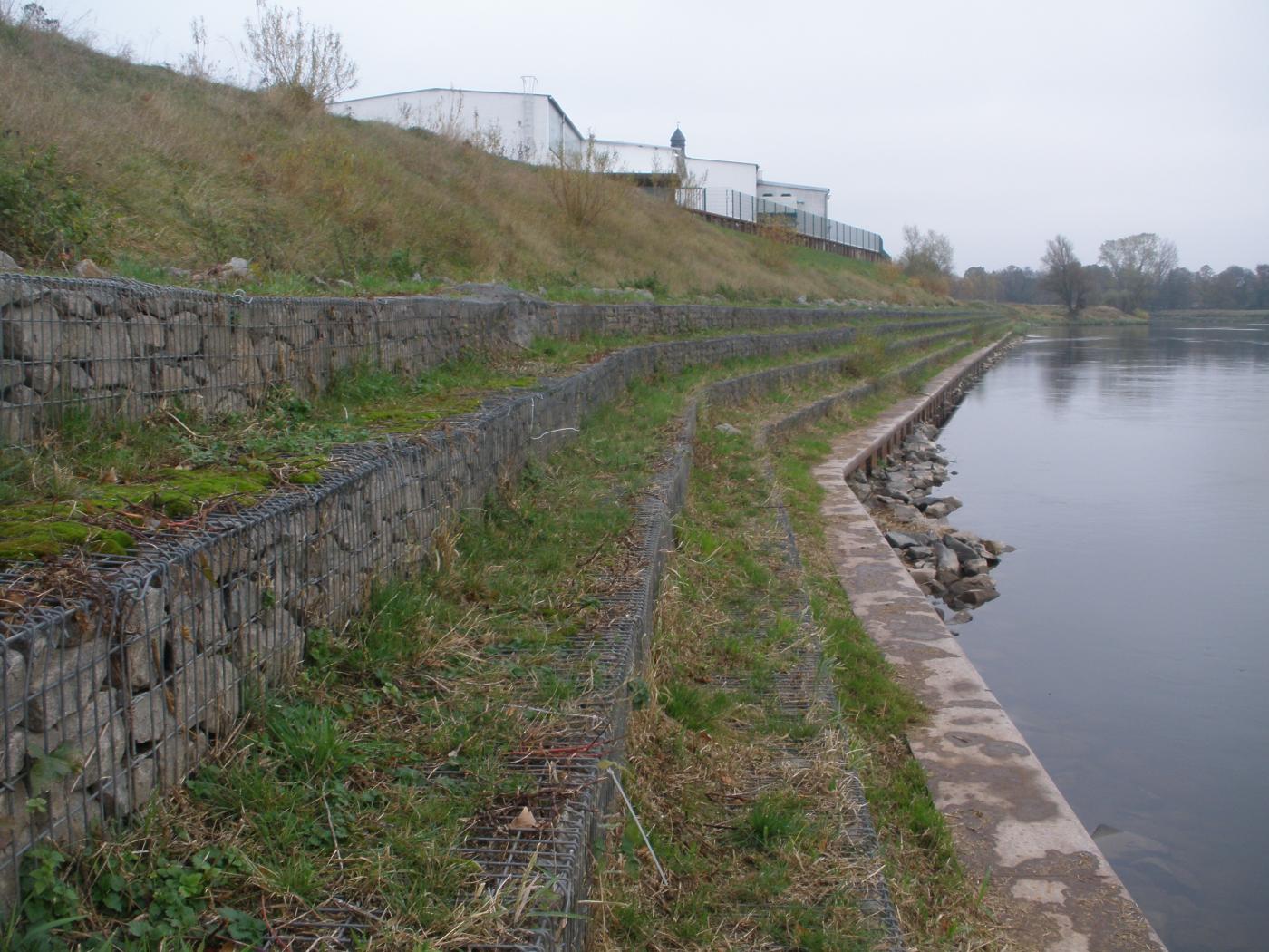 Mit der Maßnahme Teil 2 wurde die Erosionssicherung und Stabilisierung der steilen Uferböschung mit Stahlspundwand und anschließender Gabionenwand sowie ingenieurbiologischer Bauweise unter Beachtung der oberhalb sich befindenden sensiblen Werkhalle realisiert.